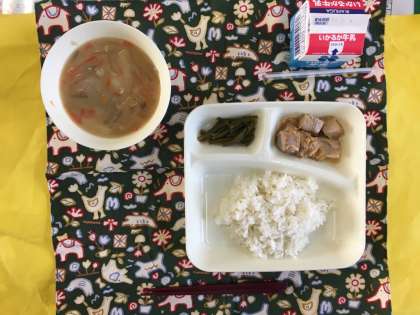 まぐろの甘辛焼き、豚汁、茎わかめのつくだ煮、ご飯、牛乳