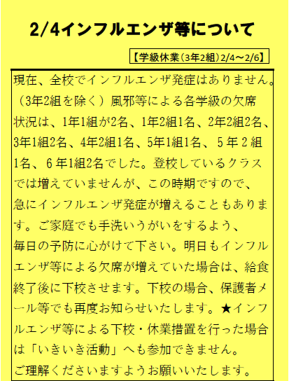 明日もインフルエンザ等による欠席が増えていた場合は、給食終了後に下校させます。下校の場合、保護者メール等でも再度お知らせいたします。