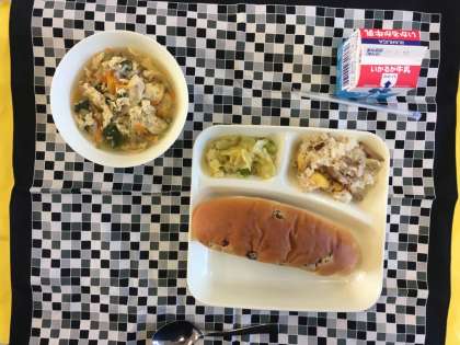 中華おこわ、卵スープ、キャベツのオイスターソースいため、レーズンパン、牛乳