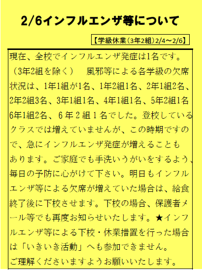 明日もインフルエンザ等による欠席が増えていた場合は、給食終了後に下校させます。下校の場合、保護者メール等でも再度お知らせいたします。