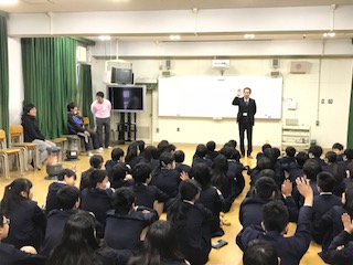 ビデオメッセージを聞き、中学校の校長先生から