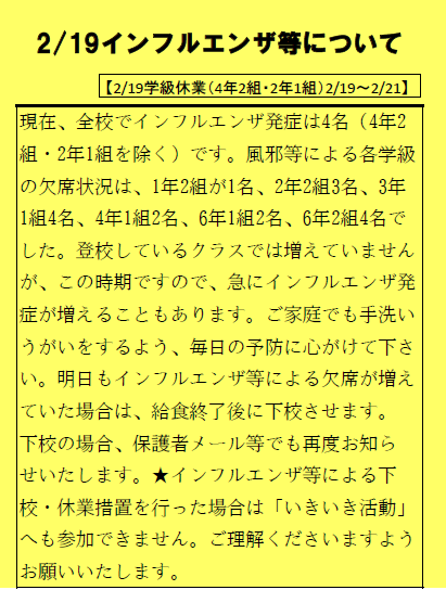〔学級休業4年2組・2年1組 2/19〜2/21〕