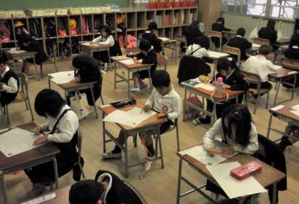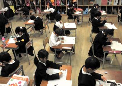 1年1組は、担任の先生が出張のため自習の時間にテストを行いました。