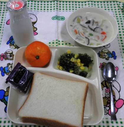 きのこのクリームシチュー、ブロッコリーとコーンのサラダ、みかん、食パン、ブルーベリージャム、牛乳