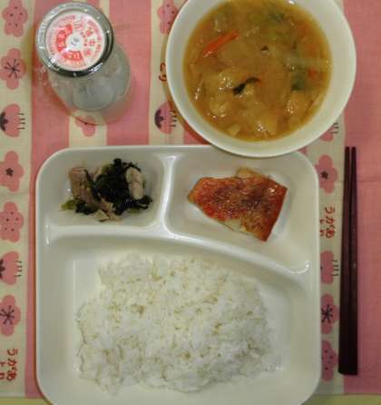赤魚のしょうゆだれかけ、みそ汁、こまつなの煮びたし、ご飯、牛乳