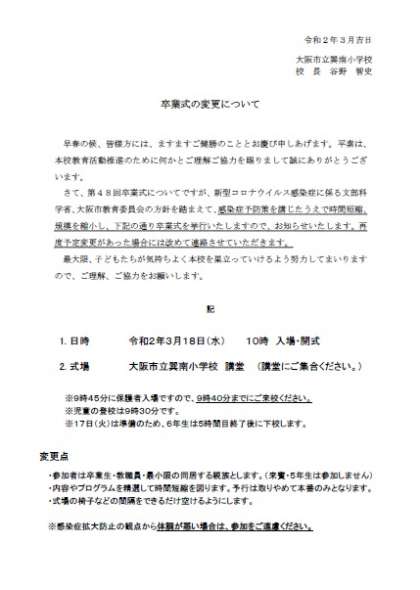 卒業式の変更についてのご連絡