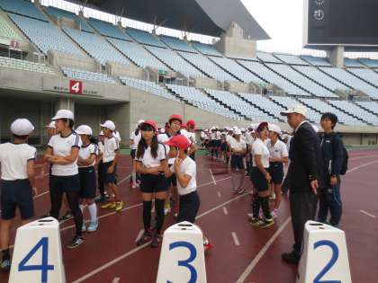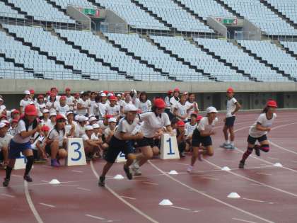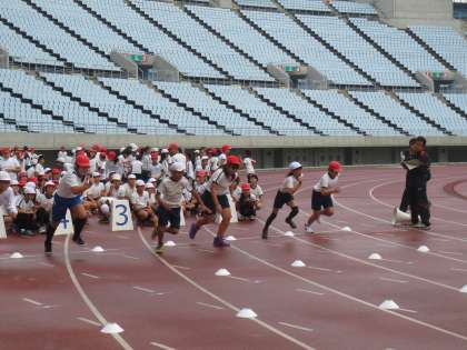 最初の種目は100m走です。タータントラックを全力で走り切っていました。でも、子どもたちは、セパレートコースをまっすぐに走ることが意外に難しそうでした。