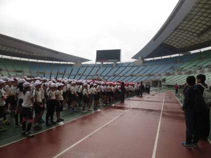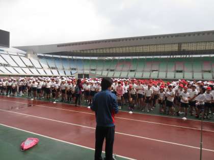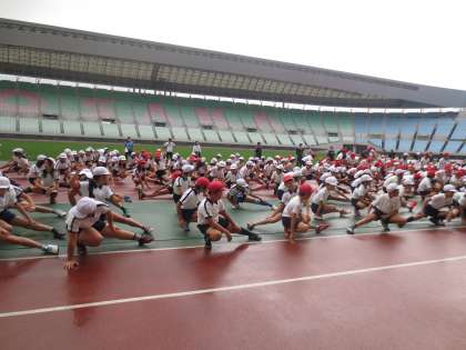 生野区・大正区・此花区の小学校11校(552名)が整列し、開会式が始まりました。いよいよ熱戦が開始されます。