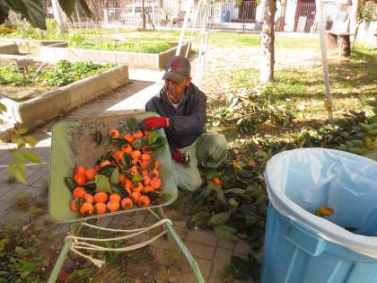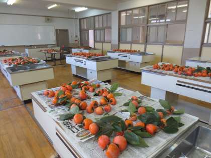 運動場緑化委員会(巽南ガーデニングクラブ)の保護者の方々が、家庭科室に集まり、干し柿づくりをされます。今日は管理作業員さんが450個程の渋柿を切り取って、干し柿をつくる準備をしてくださいました。