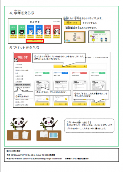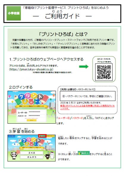 つきましては、担任より配付しております課題に加えて、必要なご家庭は下記の「ご利用ガイド」を参考にご活用ください。なお、利用にはユーザーIDとパスワードが必要ですので、そちらは保護者メールにてお知らせしています。