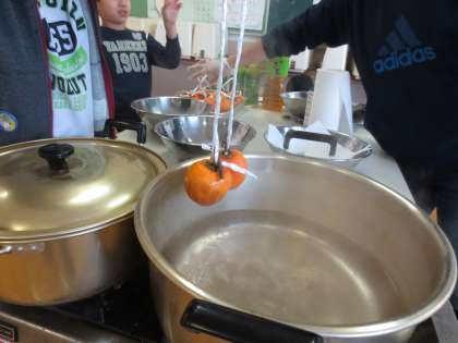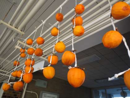 渋柿の皮をむき、紐にむすび、熱湯・焼酎につけ、4週間ほど干せば美味しい「干し柿」の出来上がりです。みなさんが協力してつくっていただいた干し柿は、正面玄関を入ったところに吊るしておきますのでご覧下さい。