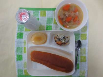 鶏肉と野菜のスープ煮、ほうれん草のグラタン、白桃(缶)、パンプキンパン、牛乳