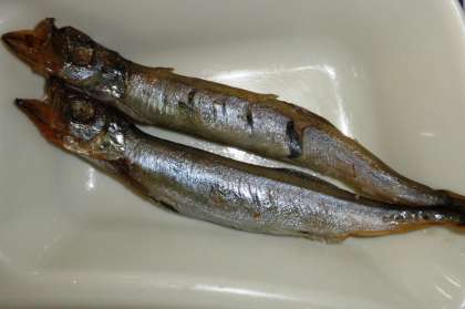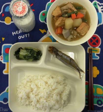 焼きししゃも、鶏肉とじゃがいもの煮もの、おおさかしろなのごまあえ、ご飯、牛乳