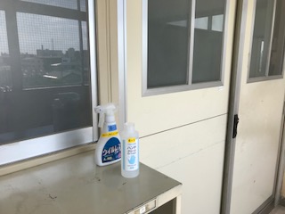 教室入口に、消毒用のウィルレスウォーターとハンドクリーンローションを置いています。