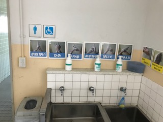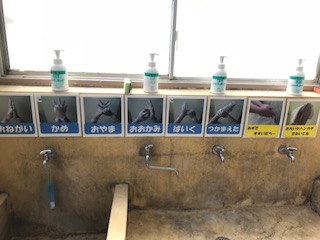 トイレや手洗い場所には、石鹸を置き、手の洗い方をわかりやすく写真で説明しています。