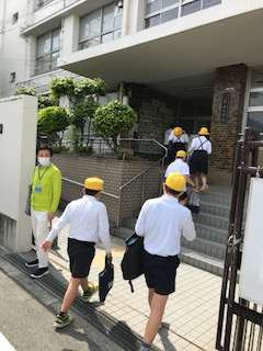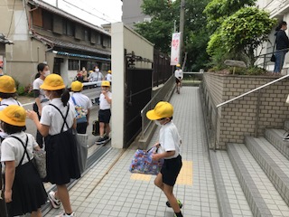 全学級2つのグループに分かれての分散登校です。子どもたちも少し慣れてきました。検温や手洗い・消毒も忘れず、先生や友だちとも、距離(ソーシャルディスタンス)や音量を考えながら会話をしていました。