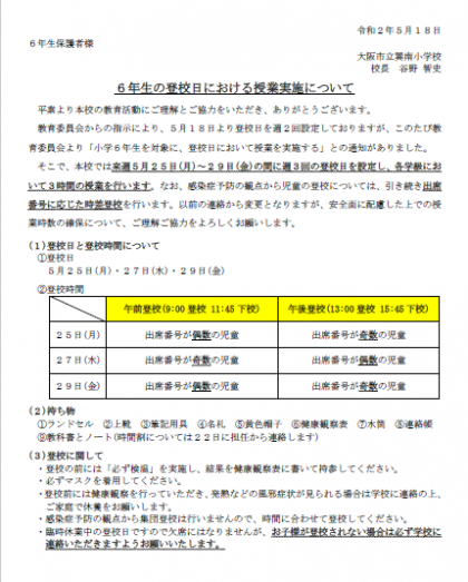 大阪市教育委員会より「臨時休業期間中の登校日における授業実施について」の通知がありました。『小学6年生を対象に、登校日において授業を実施すること』
