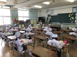 1年生・6年生の給食時間のようすです。どの学年の子どもたちも、新しい生活様式を意識して、会話を控え、静かに食べていました。