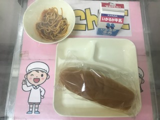 今日の献立は、「コッペパン・牛乳・スパゲッティミートソース」です。おかわりをする子どももいました。子どもたちの表情から、「おいしい」という声が伝わってくるようでした。