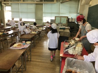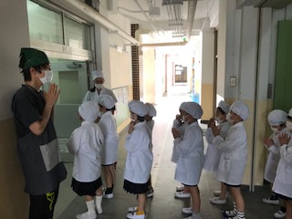 2年生以上の学級では当番の児童が、給食室へ食缶などを取りに行きます。給食室の前で整列し、「いただきます」のあいさつをします。