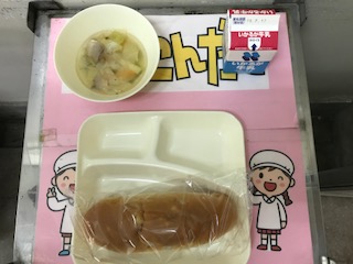 今日の献立は、「おさつパン・牛乳・豚肉とキャベツのスープ」です。