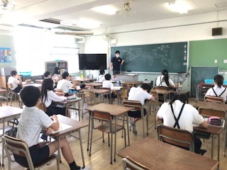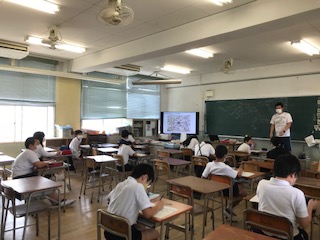 1組・2組ともに新巽中学校の先生の問いかけに、子どもたちが素早く反応を返していました。新しいことをいっぱい学んでいきましょう。