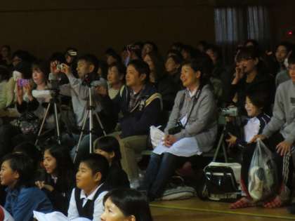 「今日は1年から6年まですべて見せていただきました。皆、それぞれ自分のパートを精一杯頑張っている姿に感動しました。1年と4年に子どもがいるのですが、はじめて全部見て、本当によかったと思いました。ふるさとという歌、とてもよかったです。」