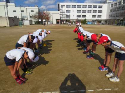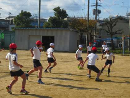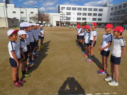 挨拶をしてミニゲームをしている男子です。良い動きをする児童が多くいました。