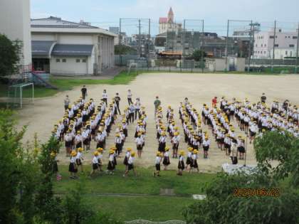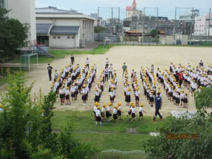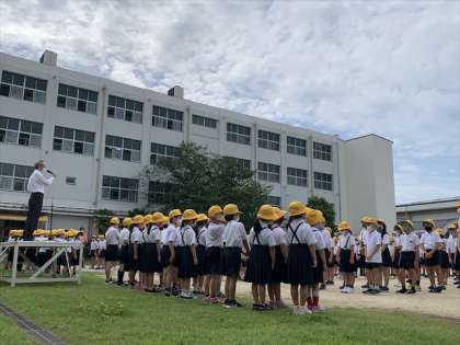 今朝、全校朝会の時間に、運動場で対面式が行われました。音楽とともに1年生が2〜6年生のみんなの前に歩いて登場しました。