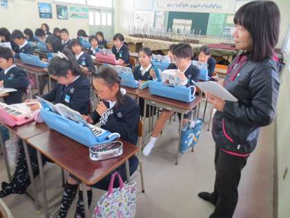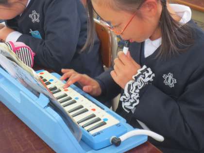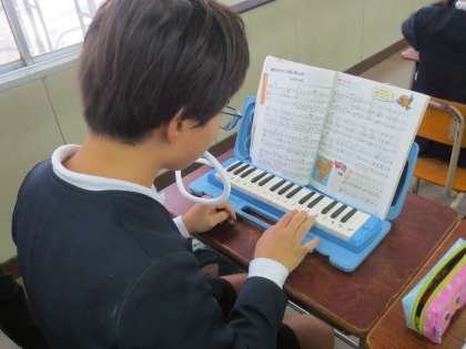 「キリマンジェロ」をピアニカで演奏するテストをしています。かなり緊張していました。