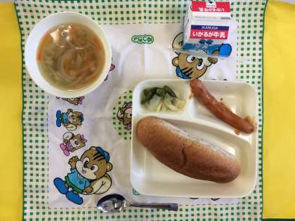 ウインナーのケチャップソース、スープ、キャベツとさんどまめのサラダ、ライ麦パン、牛乳