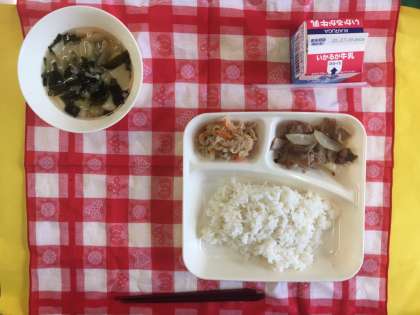 豚肉とたまねぎをしょうゆと砂糖で甘辛い味つけにして焼いています。ご飯のすすむ献立です。