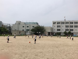 運動場ではボールを使った運動、体育館ではマット運動をしていました。
