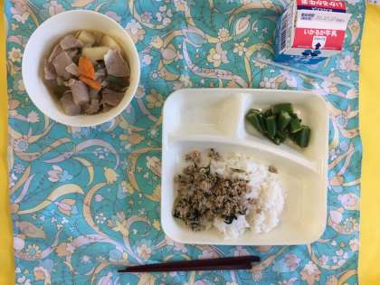 豚肉とじゃがいもの煮もの、オクラの梅風味、ツナっ葉いため、ご飯、牛乳