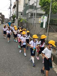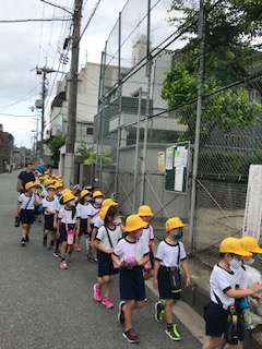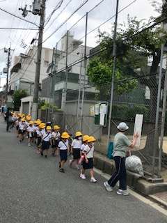 きちんと2列になって歩いています。校区内の公園をまわりました。