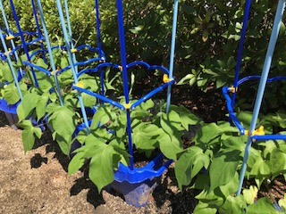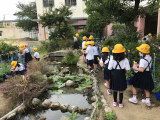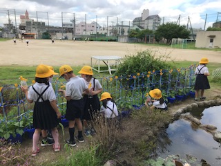 1年生の子どもたちが、「あさがお」に水やりをしています。「見てみて」と呼びかけているようです。少しずつ大きくなってきました。