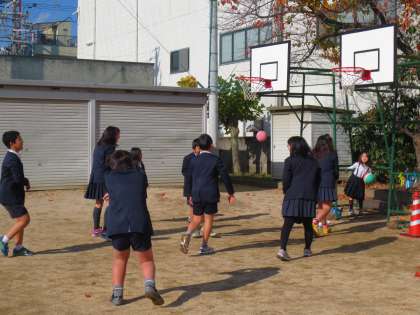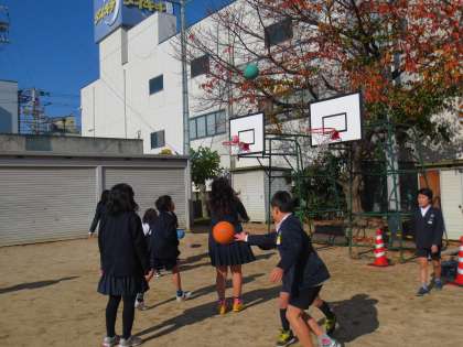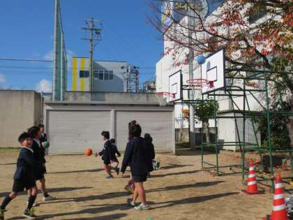 バスケットボールを楽しんでいる児童もいます。遠くからでもゴールに上手く入れていました。
