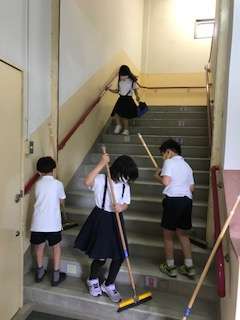 教室や廊下・階段を、当番の子どもたちが、丁寧に掃き掃除や拭き掃除をしています。