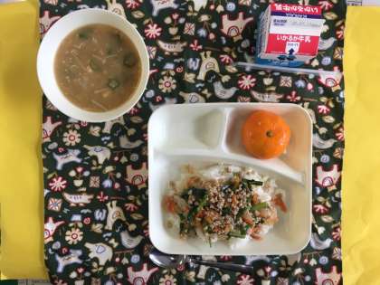 豚ミンチとニラのそぼろ丼、オクラのみそ汁、みかん(冷)、ご飯、牛乳