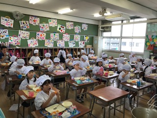1年生の子どもたちが、美味しそうに給食を食べています。
