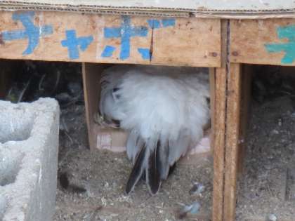一週間ほど前から白チャボのメスが小屋に入って出てきません。おなかの下に6個の「たまご」をだいています。寒い季節で心配しますが・・・ひよこの誕生を期待しています。