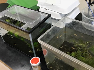 理科室の水そうでメダカを飼育しています。子メダカもいます。