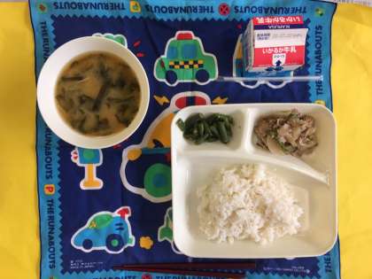 豚肉のしょうが焼き、みそ汁、さんどまめのごまあえ、ご飯、牛乳