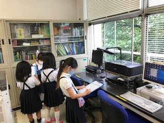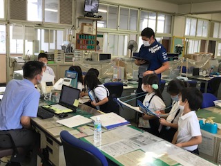 職員室では、教頭先生が子どもたちの質問に答えていました。ワークシートに職員室にあるものをかいています。