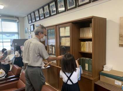 6〜7人のメンバーで、校長室・管理作業員室・職員室・パソコン室・理科室・音楽室・家庭科室・保健室を、たんけんし、子どもたちが一人ずつ担当の先生に質問をします。質問が終わったら、たんけん終了の時間まで持ってきたワークシートに絵をかきます。