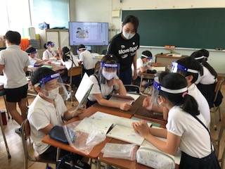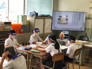 1組の国語科「環境問題について報告しよう」の単元です。子どもたちは、フェイスシールドを着用して、「書いた文章を友だちと読み合い、説明が分かりやすいと感じたところや、資料がうまく活用できていると感じたところなど感想を伝え合う」グループ学習をしています。