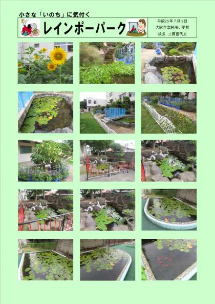 右の配布文書「校長だより」に夏の池・小川の様子を載せております。