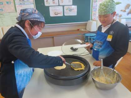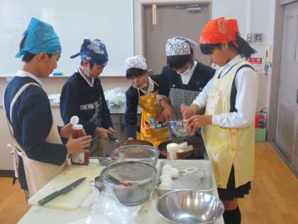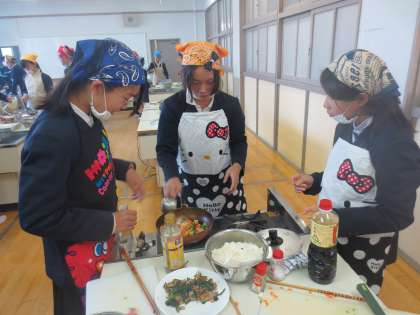 グループごとに3品の調理をしています。安全に気をつけて楽しく調理をしています。