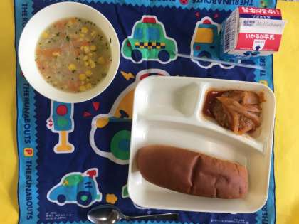 煮こみハンバーグ、コーンスープ、パン、牛乳