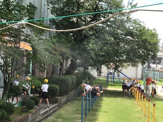 運動場のようすです。広い運動場が子どもたちの遊びの舞台となります。今日もミストシャワーが降っています。